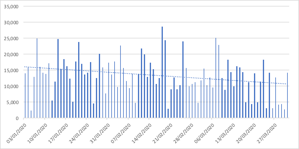The stats for the last two weeks of March are low — down more than one third on the first 10 weeks of 2020. There are several days when I have barely walked at all, offset by days shopping for my parents. I should probably aim for more consistent exercise…